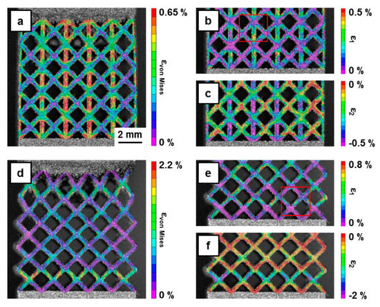 The distribution of the Von-Mises strains in the bcc lattice structure (Figure 7d) points at high local concentration of strains in the upper and lower parts of the specimen with local values of up to 2.2%, which is clearly higher than the applied macroscopic strain of 1%. The principal strain plots (Figure 7e,f) show that both the maximum and the minimum principal strains are high, with the positive strains being present on the upper half and the negative strains being observed on the lower half of individual struts. This kind of local strain pattern strongly indicates local bending. With respect to the absolute values derived from the DIC data, it has to be noted that the struts of the bcc structure are inclined with respect to the image plane and, thus, a certain deviation to the actual strains is likely. However, the qualitative strain distribution as well as the comparative assertions made with respect to the f2ccz-structure are seen to be valid.