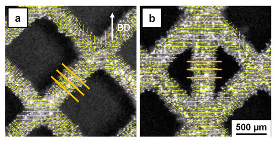 Maximal principal strain vector plots for 316L (a) bcc and (b) f2ccz lattice structures as obtained by DIC at a macroscopic strain of 1%. The main direction of the vectors is highlighted by the yellow lines in each subimage, the position of the respective sections is highlighted by red squares in Figure 7. The sections of the lattice shown are cropped from the entire structure—recompiled from [35].