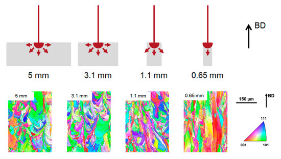 For the 316L alloy, the vertically built struts show a strong dependency of both texture and grain size towards their diameter. With decreasing diameter, changes from a rather fine, globular and weakly textured microstructure to a coarse, elongated and strongly textured microstructure are seen (Figure 5). This miniaturisation phenomenon can be explained through changes in the solidification conditions, the prevailing temperature gradients and the overall thermal history of a given volume element. Details on fundamental solidification effects and the impact of rapid solidification on microstructure evolution can be found in literature, e.g., [53,54]. In case of additive manufacturing, geometry and microstructure are established in parallel. Thus, changes in geometrical features on a given plane of view (cf. Figure 10) are directly connected to the scanning strategy within the given layer, eventually affecting very important process inherent characteristics such as the return time, i.e., the time interval between irradiation of two strongly overlapping volume elements of the structure. This can lead to significant changes of the melt pool shape, temperatures in the top layer and other process characteristics. This, for one thing, leads to a change of solidification velocity and, thus, change of prevalent grain sizes. Furthermore, in the case of miniaturisation of structural elements, the thermal gradient is strongly directed towards the building platform, as the heat can only be dissipated through the layers underneath, i.e., the already solidified material (as its thermal conductivity is much higher as in case of the loose powder), cf. Figure 11. In combination with the driving force imposed by epitaxial grain growth, this results in a strong <001> texture and grains being significantly higher in length (parallel to BD) than the powder layer thicknesses employed in the process. Such aspects have been numerously reported in literature, e.g., by Thijs et al. for additive processed tantalum [24]. For bigger cross sections, the return times can be much longer, while the local heat is effectively distributed in the solid material surrounding the melt pool, promoting the typically observed microstructure for additive manufactured material (as shown in Figure 5 and Figure 11 for the specimens with diameters of 3.1 mm and 5 mm). All the aforementioned aspects are highly relevant for miniaturised, thin walled lattice structures. In the case of the two different lattice types considered, different cross section patterns are exposed as shown schematically in Figure 10. Consequently, the strut inclination angle does not only have an impact on the geometrical discrepancies discussed before, but also leads to slightly different microstructures in each strut. Similar conclusions were reported for additively manufactured notch specimens made from stainless steel 316L, where a strong impact of ligament dimensions on locally prevailing microstructure and eventually mechanical properties was reported [21].