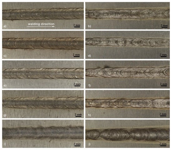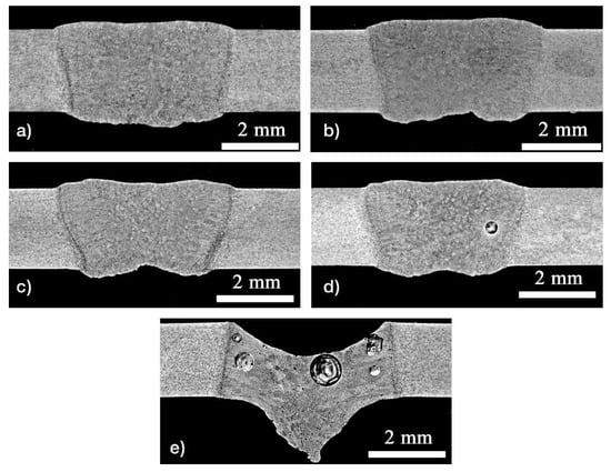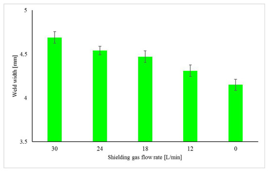 Figure 4 depicts the relationship between the shielding gas flow rate and the weld width. The largest weld was created when a 30 L/min (a) shielding gas flow rate was used. Alternatively, the narrowest weld joint was created when no shielding gas was used (e). The lower the gas flow rate, the narrower the width of the WM. Ahn et al. found that the width of the weld joint created in argon was wider than that of the weld joint produced in a helium shielding atmosphere [64]. Reisgen et al. found that weld joints were shallow when Ar was used as the shielding atmosphere. They explained that this was due to a plume formation above the weld metal and thus instability of the welding process, which caused spatter and a poor surface appearance of the weld joint [65].