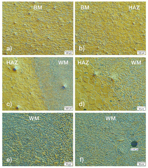 Optical microscope images of the microstructure of (a) base material (BM); (b) BM–heat affected zone (HAZ); and (c) HAZ–weld metal (WM); (d) a higher magnification of (c); (e) the WM of the Aluline He30 shielded weld joint; (f) the WM of a different area of the weld joint.