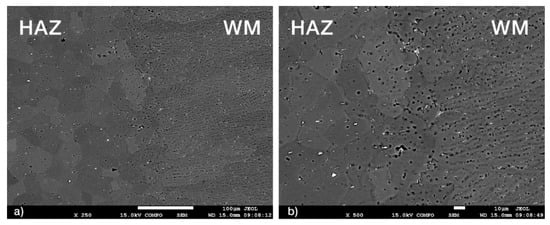 Scanning electron microscope (SEM) images of (a) HAZ–WM; (b) a higher magnification of part of the region shown in (a).