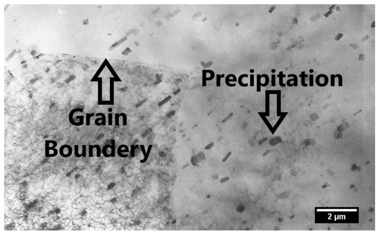 TEM image detailing the precipitates in the matrix, which were observed inside the grains.