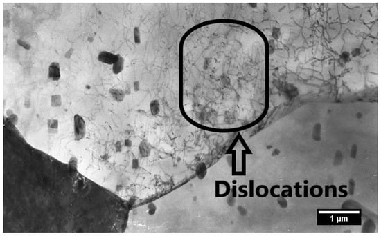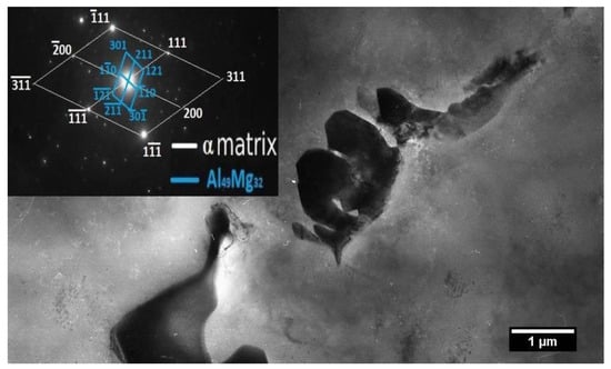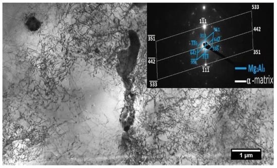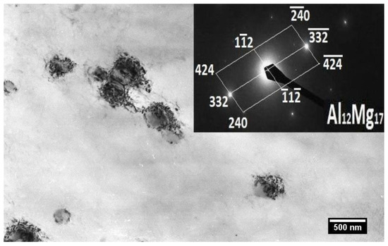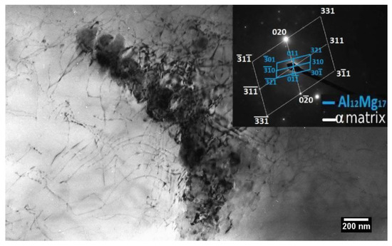 The microstructure of the base metal (BM) observed by TEM is documented in Figure 7. The matrix microstructure of BM manifests polyhedral morphology and is formed by the substitution of the solid solution of the alloying elements in aluminum. An excessive precipitation of smaller particles with a regular geometric shape was observed inside grains. Alternatively, only a small amount of grain boundary precipitation was observed (Figure 8). These particles were identified as the Al12Mg17 intermetallic phase (Figure 9). A slight heterogeneity in the precipitate density, as well as the dislocation density, was also observed.