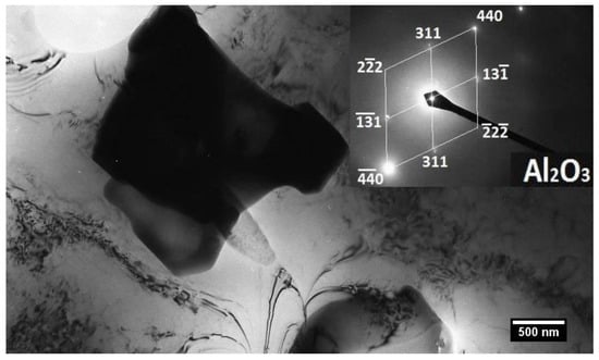 The microstructure of the weld metal has a dendritic morphology. The matrix consists of the solid solution of the alloying elements in aluminum. A significantly higher dislocation density was observed in the WM, compared to the BM. The majority of the particles are irregularly shaped. No particles were observed within the dendrites. The presence of the intermetallic phases, Mg2Al3, Al12Mg17, and Al49Mg32 (Figure 10, Figure 11 and Figure 12), were confirmed by electron diffraction. Secondary precipitation phases were mainly observed in the inter-dendritic area, Figure 11. Similar results are reported by Mofid et al. They recorded two inter-metallic compounds in the weld metal, namely, β-Al3Mg2 and γ-Al12Mg17 [68]. Goswami et al. detected the β-phase through high-resolution TEM analysis [30]. Ding et al. [69] found β-phase precipitates along grain boundaries. Choi et al. [70] studied the behaviour of β-phase (Al3Mg2) in AA 5083 during friction stir welding. The results of electron probe micro-analyzer analysis showed that the precipitated β-phase (Al3Mg2) existed along the grain boundaries in the matrix. Zhang et al. [37] found that most particles in the AA5083 aluminum alloy are β-phase. They also recorded the presence of a small number of Al x Mn dispersoids. Observed dispersoids had a square or rectangular shape, while the β-phase had a random or irregular shape. Panteli et al. [71] detected in their study the presence of both phases a β-Al3Mg2 and γ-Al12Mg17 by XRD. Shahid et al. [72] recorded the same results in their study. In Figure 13, Al2O3 is present, which is probably the cause of a brittle fracture in the WM of the unshielded weld joint. A higher amount of Al2O3 particles was recorded in the unshielded weld joint in comparison to the protected weld metal.