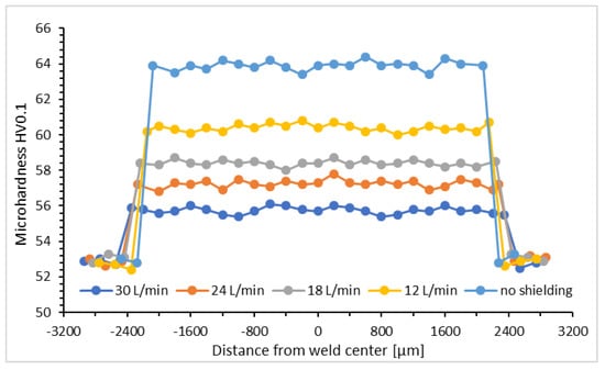 - The lowest average microhardness was measured in the weld that was protected under the 30 L/min gas flow rate during welding, namely 55.4 HV0.1. An increase in the microhardness was caused by the grain refinement due to the presence of Zr in the filler wire and the high cooling rate that is characteristic of laser beam welding. Conversely, the highest microhardness (63.9 HV0.1) was recorded in weld no. 5. Increased values of the microhardness are probably caused by oxidation of the molten weld pool, because of the lack of protection of the WM during laser welding. It is evident, from the recorded values of the microhardness, that the gas flow rate had an effect.