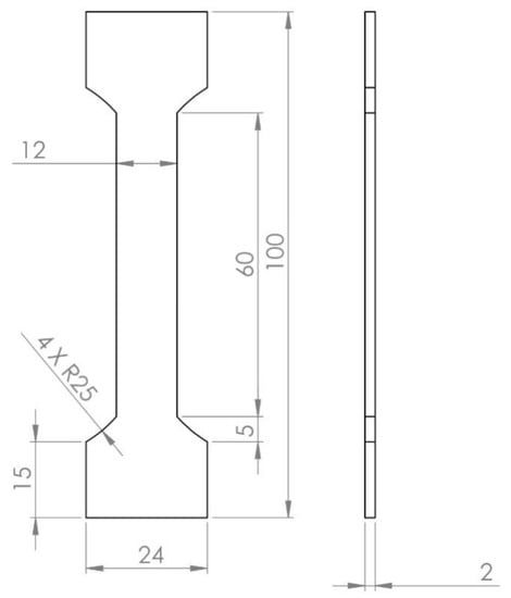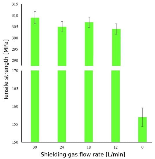 Figure 15 shows the dimensions of the tensile test specimen. Figure 16 shows the variations in the tensile strength on the gas flow rate. The average value of the three tested samples for every weld was computed. The maximum tensile strength was observed when the 30 L/min shielding gas flow rate was used, namely, Rm = 309 MPa (±2.94). These specimens also manifested the highest ductility, i.e., 29.96% (±0.49). The weld joint created under the 24 L/min shielding gas flow rate achieved a tensile strength of 307 MPa (±2.52), and its ductility was 27.25% (± 0.45). The tensile strength of the weld joint produced under the 18 L/min shielding gas flow rate was Rm = 305 MPa (±2.45) and ductility value was 26.03% (±0.56). The weld joint produced under the 12 L/min shielding gas flow rate achieved a tensile strength of 304 MPa (±3.27) and ductility value was 25.64% (±1.05). A tensile strength of only 160 MPa was recorded when the weld joint was welded in the ambient atmosphere without the use of a protective gas. This result can be attributed to the high porosity of the WM. A possible reason for the pore formation in the WM is a keyhole collapse during the course of welding. Elements with relatively low boiling points, such as magnesium, tend to evaporate during laser welding. Developed gases are captured by the molten metal in the weld pool, which in turn leads to the formation of pores [74]. In [75], Al2O3 was found to be hygroscopic and supported the capture of moisture from the atmosphere. Toda et al. [76] found that the mechanical properties of aluminum alloys are susceptible to the development of micropores. Aside from this fact, they indicated that the lower ductility and decreased mechanical properties and fatigue characteristics can be related to the high density of the micropores in aluminum alloys. They also indicated that the tensile strength decreased substantially when the volume of micropores increased.