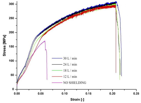 The stress–strain curves for the welds created at various gas flow rates are shown in Figure 17. The gas-shielded laser weld joints are characterized by much greater area below the stress–strain curves than can be seen for a non-protected weld joint. This indicates much better ductility (and toughness being represented by work until the fracture) of joints produced with use of shielding gas. On the other hand, low ductility (and toughness) of non-protected joint may be associated with the formation of heterogeneities and micro-pores, as above discussed.