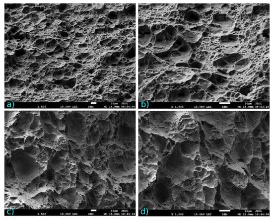SEM images of the fracture surface of the welds created with the 30 L/min gas flow rate are shown in Figure 18a,b. From the images of the fracture surface, a ductile fracture can be observed. This fact is attributed to the dimples that are present on the fracture surface. The application of Aluline He30 (30 L/min) was effective, because no pore was observed on the fracture surfaces. Except for the weld that was produced without the use of shielding gas (Figure 18c,d), a fracture was observed in the base metal. From the images (Figure 18c,d) of the fracture surface, a brittle fracture can be observed. The sample fractured in the WM. Understanding the connection between the fracture behavior and microstructure is essential. Because many secondary phase particles are contained in the metal, they cause ductile fractures of aluminum alloy. The ductile fracture process is as follows: nucleation > growth > coalescence of the voids. In the void nucleus are particles of the precipitate, inclusion, or dispersoid [77].