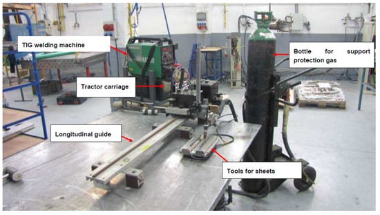 Automatic welding equipment: including sheet tooling, traction carriage on longitudinal guide rail to automatically control welding speed, Tungsten Inert Gas (TIG) welding machine to apply constant thermal input parameters, and shielding gas connection to perform welding under inert gas.