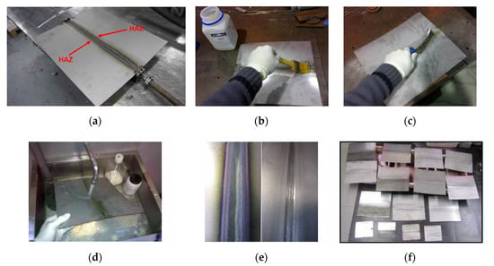 Welded coupons for testing, already prepared after pickling and passivation: (a) Detail of the HAZ appearing after welding; (b) Application of pickling and passivation product; (c) Removing the pickling and passivation product; (d) Sample and weld seam cleaning; (e) Comparison of the welded seam before and after pickling and passivation; (f) Welded coupons prepared for testing.