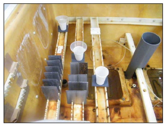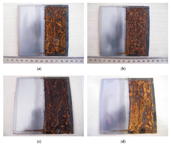 These tests are followed by destructive neutral salt spray (NSS) according to ISO 9227 [22]. Therefore, the samples were sprayed in a 5% sodium chloride solution within the pH range of 6.5 to 7.2 in a controlled environment, with an exposure duration up to 216 h. Figure 4 shows the coupons placed inside test chamber