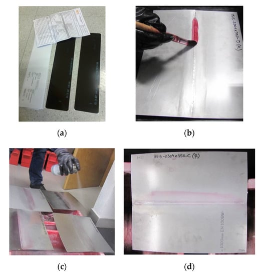 X-ray and penetrating liquids non-destructive testing performed on samples: (a) X-ray plates and test certificates of samples; (b) Application of penetrating liquids in red; (c) Application of revealing product after cleaning; (d) 2304 Duplex Stainless Steel (DSS) sample showing a good result with no penetration.