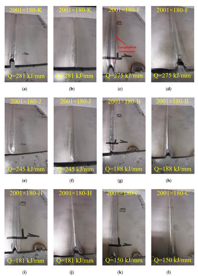 Welded coupons of 2001 steel from welding face and root sides: (a) 2001 × 180-K from the welding face side (Q = 281 kJ/mm); (b) 2001 × 180-K from the welding face side (Q = 281 kJ/mm); (c) 2001 × 180-F from the welding face side (Q = 275 kJ/mm); (d) 2001 × 180-F from the welding face side (Q = 275 kJ/mm); (e) 2001 × 180-J from the welding face side (Q = 245 kJ/mm); (f) 2001 × 180-J from the welding face side (Q = 245 kJ/mm); (g) 2001 × 180-B from the welding face side (Q = 188 kJ/mm); (h) 2001 × 180-B from the welding face side (Q = 188 kJ/mm); (i) 2001 × 180-H from the welding face side (Q = 181 kJ/mm); (j) 2001 × 180-H from the welding face side (Q = 181 kJ/mm); (k) 2001 × 180-C from the welding face side (Q = 150 kJ/mm); (l) 2001 × 180-C from the welding face side (Q = 150 kJ/mm).