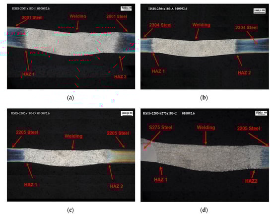 Cross-Section welded joint macrographies: (a) 2001-2001 steel joint with ×12 Magnification; (b) 2304-2304 steel joint with ×9 Magnification; (c) 2205-2205 steel joint with ×8 Magnification; (d) 275-2205 steel joint with ×9 magnification.
