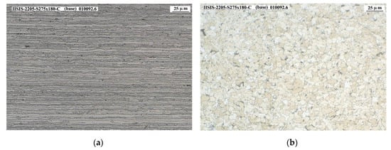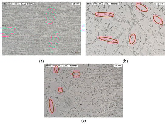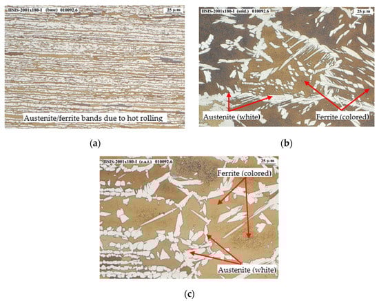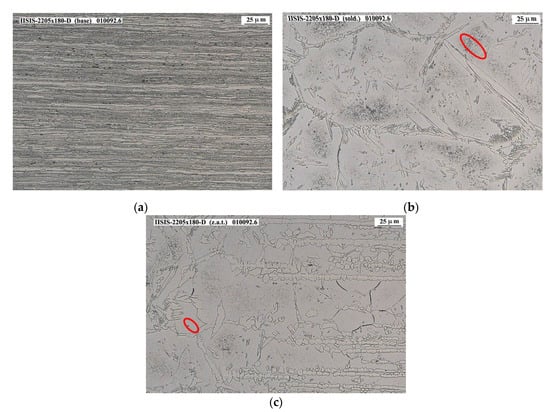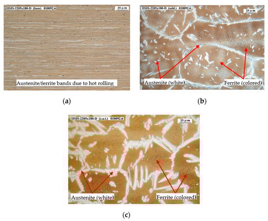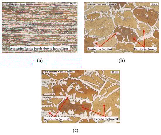 Figure 12a–c shows the micrographies corresponding to 2001 base material, welding and HAZ zones, respectively. In these last two zones, precipitates or intermetallic phases are appreciated in some areas of the grain edges, in small quantities, such as the sigma phase or the chi phase. It should be mentioned that the appearance of the sigma phase cannot be confirmed by optical microscope means only, but rather a SEM would have to be used. However, the number of indications detected is considered low, so that even with SEM electron microscope analysis it would be difficult to define the nature of these indications.