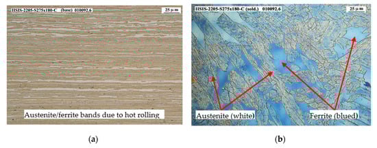 Hence, macrographies and micrographies for microstructural analysis have been performed and the results show clearly separated zones corresponding to base metal, HAZ and welding zone, see Figure 7. Ferrite content in base steel was found to be around 53–60%, with 68–72% at HAZ and 73–86% at welding zone. However, an unexpected decrease in the percentage of ferrite is observed in the welding zone of S275-2205 hybrid steel joint in comparison with the austenitic-ferritic base material 2205, up to 47.5%, due to the dilution between both base materials because of the welding without filler, that turned that micrograph to blue instead, see Figure 11b.