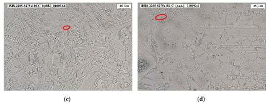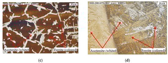275-2205 steel joint micrographies: (a) Base 2205 steel with ×400 magnification; (b) Welding zone with ×400 Magnification; (c) 2205 HAZ zone with ×400 magnification; (d) S275 HAZ zone with ×400 magnification.