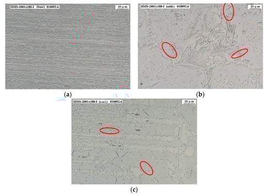 2001-2001 steel joint micrographies: (a) Base 2001 steel with ×400 magnification; (b) Welding zone with ×400 Magnification; (c) HAZ zone with ×400 magnification.