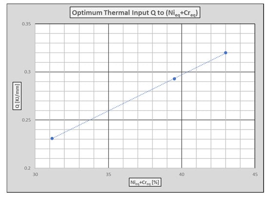 Second, adapting the Schaeffler formula [26] with the data gathered in Table 8, obtained directly from DSS chemical composition already disclosed in Table 1, shows a well fitted relationship between the summation of equivalent nickel Nieq and equivalent chromium Creq of each DSS steel grade with the corresponding optimal thermal input of its welding seams. It shows a good correlation under the initial boundary conditions, i.e., butt welding of two narrow 1.5 mm thick steel sheets with full penetration and neither spacing nor edge preparation. Thus, Figure 18 shows the linear regression performed to derive the terms of Equation (2).