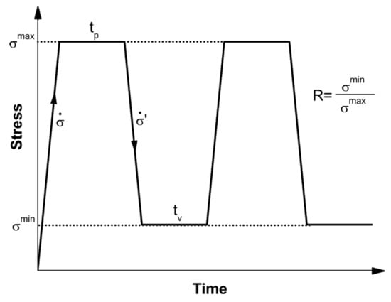 For the purpose of studying the effect of the unloading condition on the cyclic creep behavior and anelastic recovery response, a uniaxial pulsating tension–tension wave was applied under stress control as shown in Figure 2, where and are the durations imposed at peak and valley stresses. and are the stress rates of loading and unloading. The peak stress and stress ratio R were constants, which were 400 MPa and 0.0375, respectively. The loading condition was fixed at a loading rate of 12 MPa/s with a duration of 60 min. Moreover, various unloading conditions were applied with being 0.6, 12, 19, and 39 MPa/s and being 0, 10, and 30 min. The static creep test under 400 MPa was also performed as a comparison. All specimens were tested until fracture. Moreover, all the fractographic observations were carried out on the Hitachi s-4800 High resolution SEM (HITACHI, Tokyo, Japan). The SEM investigations during the observation of the fracture surface were all conducted using a 15 kV acceleration voltage and 10 mm working distance.