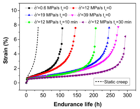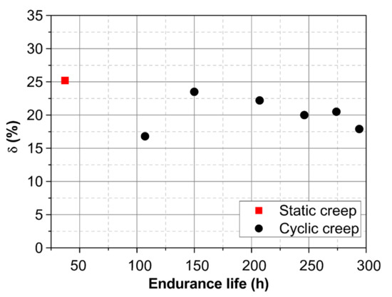 The elongation of all fractured specimens is presented in Figure 4. Cyclic creep loading leads to a slight drop in ductility as compared with static creep. However, the difference in ductility under cyclic creep seems to have little influence on endurance life. Research results showed that the fracture mode transformed from the brittle type to the ductile one and gradually approached static creep failure with the increase in duration under peak stress [11]. In this present study, a relatively long peak stress duration of 60 min has been imposed under all cyclic creep tests which means the fracture mode is most likely to be ductile, as for static creep.