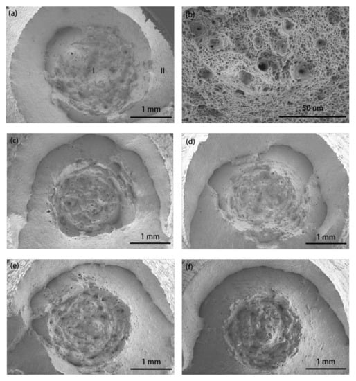 Typical fractographic morphologies of the fractured specimens under static creep and various cyclic creep tests are demonstrated in Figure 5. All the fractographies present a typical ductile failure feature with a similar cup-cone shape of necking. Two different areas including the (I) inner fibrous zone and (II) outer shearing lip can be found in Figure 5a. Creep dimples and cavities located at the center of the fibrous zone are shown in Figure 5b. Comparing with static creep, Figure 5c–f show that the fibrous zone area under cyclic creep suffers from shrinkage and this defect is more obvious in the case of a higher duration of valley stress. Besides, the distinct fatigue–creep cracks that were generated under cyclic loading in 9–12% Cr-Mo steels [30,31] are hardly detected in the examined 2.25Cr-1Mo steel. The test environment in air and the relatively low frequency adopted in this work are the possible reasons for this.