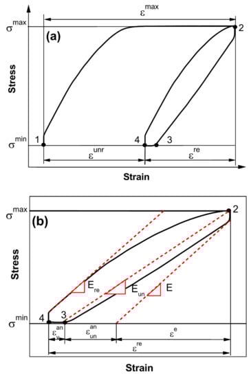 The stress–strain curve under cyclic creep is shown schematically in Figure 6, where and are the peak and valley applied stresses, respectively. The loading elastic modulus E and the reloading elastic modulus correspond to the slope of the loading stress–strain curve in the elastic range. The unloading modulus , considering its nonlinearity and complexity [32,33], can be adequately defined by the straight line connecting the peak stress and the valley stress along the unloading stress–strain curve. This is according to the fitting method of the chord modulus [34]. The strain within the two adjacent cycles can be divided into three parts as illustrated in Figure 6a including (I) , the maximum strain of one cycle which contains elastic and plastic strains during loading and peak stress holding stages; (II) , the total recovery strain; and (III) , the unrecoverable strain compared to the last adjacent cycle. As shown in Figure 6b, the total recovery strain can be further divided into three parts consisting of elastic recovery strain and two parts of anelastic recovery strain, namely and . represents the recovery of the elastic part which is related to the loading elastic modulus. For the anelastic recovery strain of the unloading stage , the value depends on the difference of the unloading elastic modulus and the loading elastic modulus which can be separated during the unloading process. Considerably, the elastic recovery strain and anelastic strain occurred simultaneously rather than separately [35]. Moreover, for the anelastic recovery strain near valley stress , it represents the further reverse slip displacement of dislocations after the unloading stage. This part of the anelastic strain under the low-stress region is regarded as the major anelastic recovery in cases with a long duration under valley stress [20]. The two parts of anelastic recovery strain indicate the existence of a two-stage recovery phenomenon when the applied stress is removed which is closely related to the change of the elastic modulus [36] and the motion of dislocations [37].