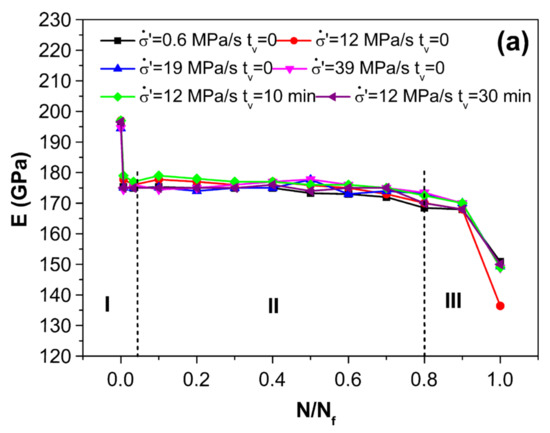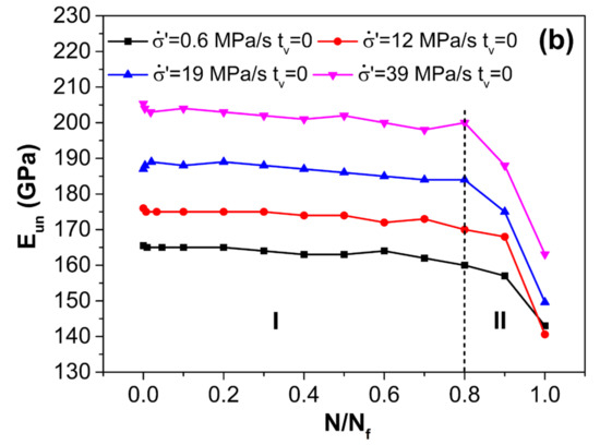 Previous works [38,39] have concluded that the ratcheting strain per cycle was influenced by loading and unloading rates which could be reflected by the loading and the unloading elastic modulus intuitively. In this work, as shown in Figure 7a, the value of the loading elastic modulus E is approximately consistent when the loading rate is fixed which is hardly affected by changed unloading conditions. The evolution during the entire life shows that E is large at the first cycle and then rapidly drops to a stable value, and further declines before fracture. In Figure 7b, the evolution of displays just two stages, where it is stable initially with a slight decrease and finally declines drastically before fracture. This indicates that the value of the unloading elastic modulus is quite sensitive to the unloading rate and it increases greatly with an increase in the unloading rate. Thus, the value of under different unloading rates can be obtained as presented in Figure 8a, where it decreases with the increase in unloading rate and maintains a constant value after the first cycle. When the stress is unloaded to the valley in the case without a duration of valley stress, the evolution of under different unloading rates is shown in Figure 8b. The value of also maintains constant during the stable stage. It is interesting to find that the value of increases significantly with the increase in unloading rate which is opposite to the trend of . Moreover, the correlation between anelastic recovery and dislocations motion could be reflected by a micromechanical modeling [40]. In this work, the range of applied stress amplitude is constant in all tests (= 455 MPa and R = 0.0375), thus a higher unloading rate leads to a shorter unloading time. Hence, the reverse slip displacement of dislocations appears less within a shorter time which causes the lower during the unloading stage. Meanwhile, more back stress remains after the stress is unloaded to the valley. Therefore, when the duration of valley stress is the same, the dislocations seem to be driven backward for a more prolonged displacement under more back stress, i.e., the higher .