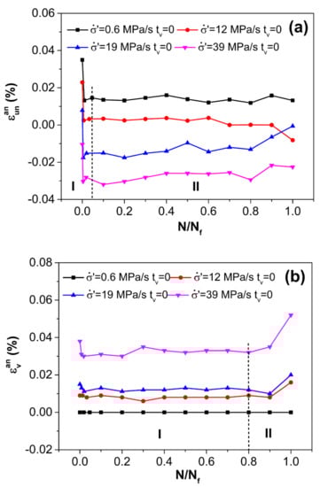 Evolutions of the anelastic recovery strain during the entire life for different unloading rates: (a) anelastic recovery strain of the unloading stage, , and (b) anelastic recovery strain near valley stress, .
