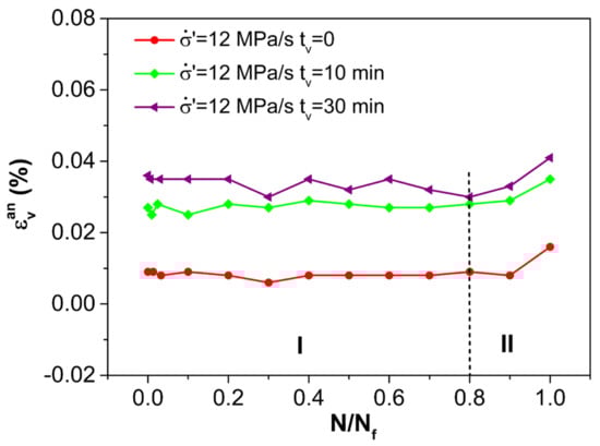 When the loading and unloading rates are consistent, the value of is fixed by the same loading and unloading elastic modulus. Hence, the duration of the valley stress becomes the main factor to influence the value of . Figure 9 presents the typical evolution of during the second cycle for different valley stress durations. It appears that develops with extended durations of valley stress and the increment extent decreases when the duration of valley stress is more than 10 min. The saturation of anelastic strain with time was reported in other studies [20,41]. It confirms that the anelastic reverse slip displacement of 2.25Cr-1Mo steel is time-dependent, while the slip displacement is finite. Moreover, Figure 10 shows the evolution of during the entire life under different durations of valley stress, which presents two stages and all the values remain constant during most of the life.