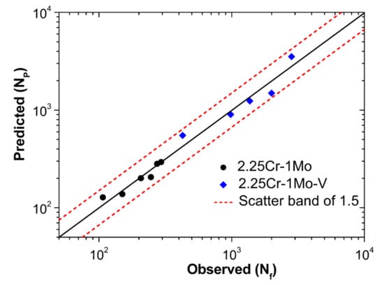 Comparison of predicted and observed cycles to failure in cyclic creep.