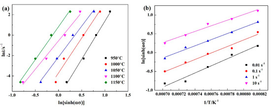 According to Equations (5) and (6), it can be seen that n1 = ln/lnσ and β = ln/σ. Substituting the true stresses and strain rates at the true strain of 0.2 under different deformation temperatures into Equations (5) and (6), the plots of lnσ-ln and σ-ln can be drawn respectively (Figure 5a,b). The lines which linear fitted in these plots are almost parallel with each other, which suggests that the temperature has a little effect on the correlation between strain rate and true stress. Therefore, the mean values of the slopes of these lines can be taken as the values of n1 and β, which are calculated to be 8.765 and 0.080 MPa−1, respectively, and the value of the material constant α = β/n1 = 0.009147 MPa−1.