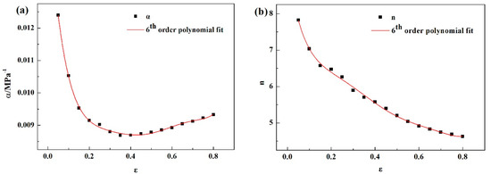 The sixth order polynomials were employed to fit the relationships of these material constants and true strain and the fitting results are shown in Equations (10)–(13), the parameters in these equations are listed in Table 1. According to Equations (3) and (4), the true stress can be expressed by a function of the Zener−Hollomon parameter at a given true strain (ε), this function is shown in Equation (14). Then the material constants at a certain true strain determined by Equations (10)–(13) can be substituted into Equation (14) and the true stress under a given true strain can be determined.