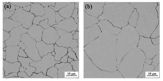 Microstructures of the experimental steel at the hot deformation conditions of: (a) 1000 °C/0.01 s−1 and (b) 1100 °C/10 s−1.