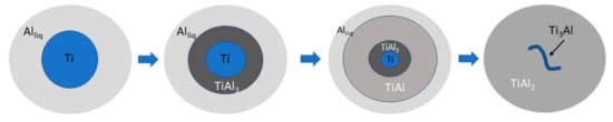 - Sujata, M.; Bhargava, S.; Sangal, S. On the formation of TiAl3 during reaction between solid Ti and liquid Al. J. Mater. Sci. Lett. 1997, 16, 1175–1178. [Google Scholar] [CrossRef]