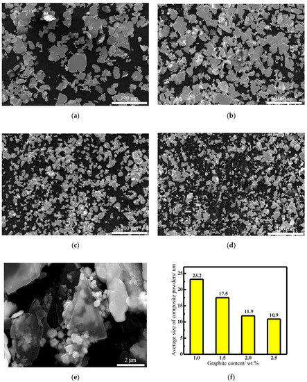 SEM images of the CGC powder with different graphite content after ball milling: (a) 1.0 wt.% (b) 1.5 wt.% (c) 2.0 wt.% (d) 2.5 wt.% (e) 2.5 wt.% (high magnification) (f) Average size of CGC powders with different graphite content.