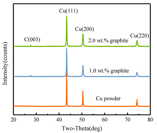 X-ray diffractometer (XRD, Empyrean, Netherland) with Cu kα radiation (λ = 1.54 Å) was used to analyze the phase of composite powders. The scanning speed and range are 10°/min and 20°~90°, respectively. The friction test was carried out by using a ball-on-disc reciprocating sliding tribometer (MFT-4000, Lanzhou Huahui Instrument Technology Co. Ltd., Lanzhou, China) at room temperature. The GCr15 steel balls with a diameter of 5 mm were used as friction pairs. All tests were performed at a sliding frequency of 5 Hz under a load of 5 N, a reciprocating amplitude of 5 mm and a test duration of 20 min, and two samples for each graphite content were subjected to the tribological test. The wear rate was calculated through the two-dimensional contour map from a three-dimensional profiler (NanoMap 500LS, AEP Technology Inc., Silicon Valley, CA, USA). These sintered samples were polished with different sand papers and diamond paste (0.25 mm size), etched by a solution of 5 g FeCl3 and 50 mL HCl in 100 mL distilled water and then thoroughly washed with deionized water and dried. The distribution of graphite, the microstructure of CGC and the morphology of the worn surface was characterized using scanning electron microscope (SEM, MLA650F, FEI Inc., Hillsboro, OR, USA). The energy-dispersive spectroscopy (EDS) attached with SEM was used to analyse the distribution of Cu and C. The electrical conductivity of CGC is measured using eddy conductivity meter (Sigma2008-B/C, Xiamen Tianyan Instrument Co. Ltd. Xiamen, China). The average values of electrical conductivity were obtained by measuring ten different positions on each sample surface and its unit is % IACS. The micro-hardness values of all these samples were examined by Vickers hardness tester (200HVS-5, Laizhou Huayin Test Instrument Co. Ltd., Laizhou, China) with a load of 0.2 kg for a dwelling time of 15 s. The average value of hardness was obtained by testing seven different locations.