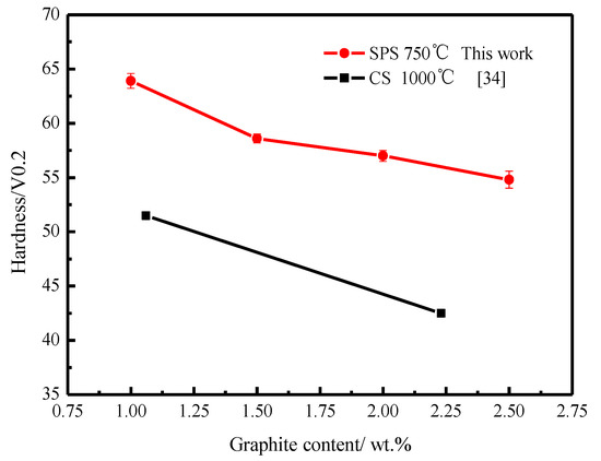 The micro-hardness values of CGC with different graphite content are presented in Figure 7. The hardness was 64 HV when the graphite content was 1.0%. These small graphite particles dispersing uniformly can prevent the movement of dislocation and improve the hardness due to the high surface energy. Graphite, as a soft material added into copper, may lead to a reduction in hardness. In addition, some porosity may occur because of the agglomeration of graphite, making the hardness decrease. Therefore, the hardness decreased with the increasing of graphite content, showing the same relationship as the literature [9]. Compared with the conventional sintering, the CGC prepared by SPS can obtain greater hardness, which may be associated with the higher relative density and finer grain size. Nayak et al. [34] prepared the CGC containing 1.06% graphite by conventional sintering and its hardness and relative density was 52 HV and 93.16%, respectively. This work got a CGC with higher hardness, 64 HV by SPS and its relative density was 98.78% when the graphite content was 1.0%. Furthermore, even though the graphite content was higher, for example 2.5%, the hardness value of CGC was still high at 55 HV.