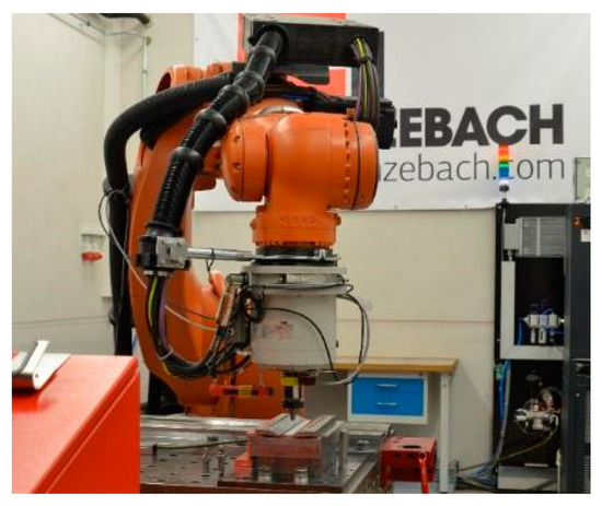 The welding experiments were performed with a robotized, force-controlled FSW setup (modified Kuka KR500 heavy-duty robot from Grenzebach Maschinenbau GmbH, 86663 Asbach-Bäumenheim, Germany) that provides an axial force up to 10 kN and a maximum rotational velocity of 14,000 rpm (Figure 2).