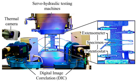 Figure 7a,b show the results of the LIT for conventional and stationary shoulder FSW respectively. The material response was monitored by extensometer, digital image correlation (DIC), thermal camera and potentiostat. As can be seen, all measurement techniques detect a stepwise material response arising from the cyclic creep phenomenon associated with the PLC effect. This effect is also known as dynamic strain aging and has been fully explained in the literature [13]. The thermal measurements do not detect any major increase in the temperature change due to the plasticization of the specimens, which again suggests the existence of the cyclic creep phenomenon.