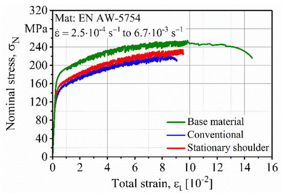 The results for the quasi-static tensile tests are shown in Figure 6. As can be seen, the stationary shoulder weld shows higher quasi-static strength than the conventional FSW. The yield strength and the ultimate tensile strength of the stationary shoulder sample reach 152.1 and 234.7 MPa, which are 9% and 11% higher than the conventional FSW samples (139.6 and 212.3 MPa). The stationary shoulder weld exhibits a higher ductility, with its corresponding total strain being improved 5% more than the conventional sample. However, the specimens manufactured with both configurations show lower strength and ductility than the base material with yield strength, ultimate tensile strength and total strain of 178.7 MPa, 245.6 MPa and 14.5, respectively.