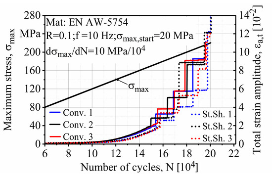 - Dengel, D.; Harig, H. Estimation of the Fatigue Limit by Progressively Increasing Load Tests. Fatigue Fract. Eng. Mater. Struct. 1980, 3, 113–128. [Google Scholar] [CrossRef]
