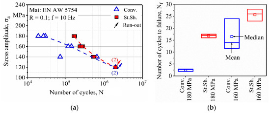 Figure 9b shows the statistical analysis of the CAT results of the conventional and stationary shoulder at stress levels of 160 and 180 MPa. It is quite evident that that CAT shows a higher scatter than the LIT, which decreases at higher stress levels. The standard deviation for the conventional FSW at 160 MPa is 6.6, which decreases to 0.5 at 180 MPa. This decrease in standard deviations is also visible for the conventional manufactured specimens from 2.5 to 0.7, as the stress level is increased from 160 to 180 MPa. Another point to note is that the stationary shoulder FSW has a higher mean fatigue life with lower scatter at 180 MPa than the conventional FSW even at 160 MPa.