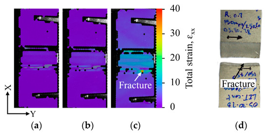 Digital image correlation (DIC) analysis of a specimen during LIT at (a) 100, (b) 180, (c) 210 MPa and (d) the fractured specimen and (e) SEM image of the crack initiation site.