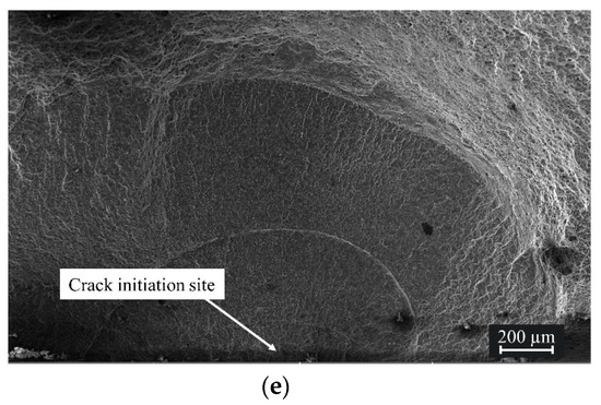 As shown in Figure 10, DIC results show strain concentration in the middle of the specimens at the weld zone. However, it can be seen from the local deformations and the moment of crack initiation that the cracks are initiated from the transition zone between the welding zone and the base material (Figure 10c). This suggests that the weld nuggets possess sufficient durability during the fatigue tests. In most of the fractures, the crack continued to propagate on a straight plane parallel to the weld. In a few cases, a crack from one transition zone propagated across the weld nugget and reached another crack on the other transition zone which caused the fracture. The cracks in the specimens of both FSW setups are initiated from the surface and towards the middle of the specimen in the Y-axis (Figure 10d).