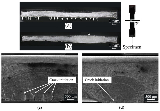 Light micrograph of the fracture surface of the (a) conventional and (b) stationary shoulder FSW specimens and SEM image of the crack initiation sites in (c) conventional and (d) stationary shoulder FSW specimens.