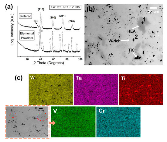 The phase formation and microstructure of W0.5(TaTiVCr)0.5 alloy sintered at 1600 °C is shown in Figure 1. The X-ray diffractogram of the sintered alloy showed formation of BCC solid solution with a lattice parameter of 0.314 nm, and formation of TiC phase (Figure 1a). TiC phase forms due to the reaction of liquid Ti with the graphite die during the spark plasma sintering [42]. The relative density of the sintered sample was measured to be 14.1 g/cm3. The microstructure of the sintered alloy showed formation of three different phases consisting of HEA (grey region), W-rich (bright region) and TiC (black region) phase (Figure 1b). The EDS elemental maps of the alloying elements in the sintered alloy show distribution of elements in W-rich, HEA-phase (marked in red circles in corresponding micrograph), and Ti-rich phase (TiC), in Figure 1c. The formation of HEA-phase (grey region) was further confirmed using EDS point analysis from grey region and bright region, marked as 1 and 2 in Figure 1b respectively, as presented in Table 1.