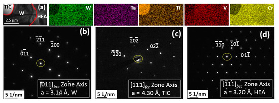 The chemical nature of various regions (W-rich, TiC and HEA) in W0.5(TaTiVCr)0.5 alloy was investigated using transmission electron microscopy (TEM). The TEM-EDS and selected-area electron diffraction (SAED) patterns of different regions are shown in Figure 2. The TEM-EDS elemental maps showed uniform distribution of all elements except Ti-rich zone and HEA phase, as shown in Figure 2a. The SAED pattern analysis in W-rich zone from [011]bcc zone axis (ZA) showed BCC reflection with a lattice parameter of 3.14 Å (Figure 2b). The Ti-rich zone with FCC reflection from [111]fcc ZA and a lattice parameter of 4.30 Å (Figure 2c) confirm the formation of TiC phase, identified as black region in Figure 1b,c. The SAED pattern at grey phase, as shown in BSE image of Figure 1b,c, from [] ZA showed BCC reflection with a lattice parameter of 3.20 Å.
