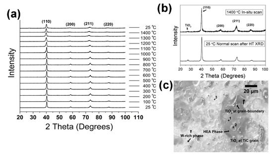 The in-situ high temperature XRD analysis of W0.5(TaTiVCr)0.5 alloy from RT to 1400 °C is shown in Figure 3. The BCC solid solution phase was observed to be stable at all temperatures without the formation of intermetallic phases (Figure 3a). The stability of the alloy up to 1400 °C can be related to high melting point of W, where the composition consists of more than 50 at. % W, which aids thermal stability. Furthermore, the high concentration of other elements enhances the thermal stability through lattice distortion leading to low thermal diffusion in the sintered alloy and enhancing the stability of BCC phase. The formation of TiO2 was observed after in-situ XRD at 1200 °C, which can be related to softening of Ti leading to its diffusion to the surface and presence of small amount of oxygen in the environment that reacts with Ti on the surface, as shown in Figure 3c and its respective EDS analysis (spot 2) in Table 2 [48]. The SEM-EDS after in-situ high temperature XRD analysis showed the W-rich phase and HEA phase to be stable after the measurement, however the oxide formation in all the phases is observed, as shown in Figure 3c and Table 2. The exact influence of each element at high temperature towards diffusion and oxide formation has yet to be determined and requires further investigation [49].